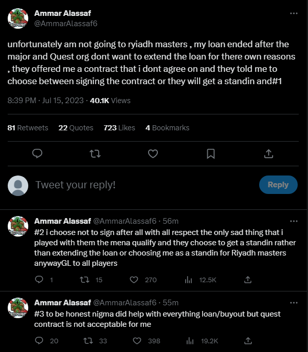 Here, the Jordanian mentions that Nigma Galaxy did their best to help him with the loan and buyout situation. Apparently, it was actually Quest Esports that offered Ammar an unfair contract. Ammar then mentions in his tweet that the contract he was offered was "unacceptable" for him