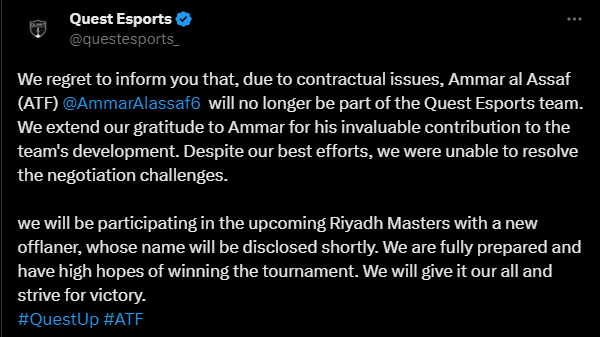 Today, information spread that Ammar will not attend Riyadh with the team due to contract issues. Hours later, Quest Esports officially announced that Ammar's contract would not be extended, ending his journey with the team.