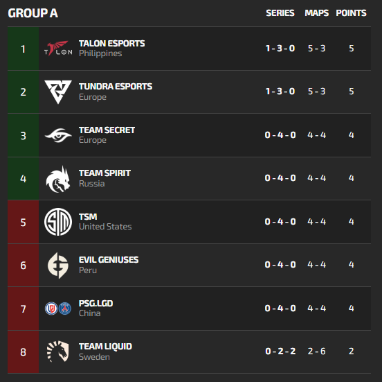 Group A is very close, with the first to seventh-place teams only having one point difference. Surprisingly, Team Liquid are sitting at the bottom of the board with only two points.