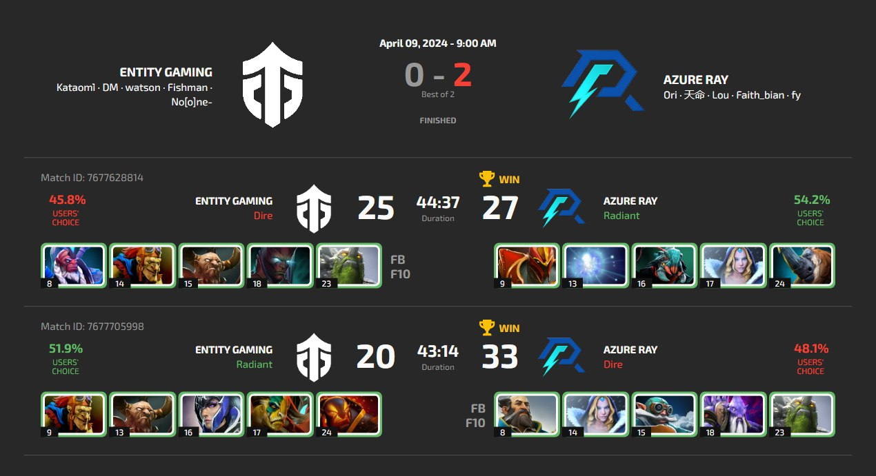 Entity Gaming, a team that has been on the rise, holding a 10-0 map streak a few days ago, has begun to struggle. In the first map against Azure Ray, the Western European roster took an early advantage. However, they did not have the heroes to lock down Lou’s Weaver, who eventually came online and carried the game. Entity could not find their footing in the second game, and lost the series 0-2.