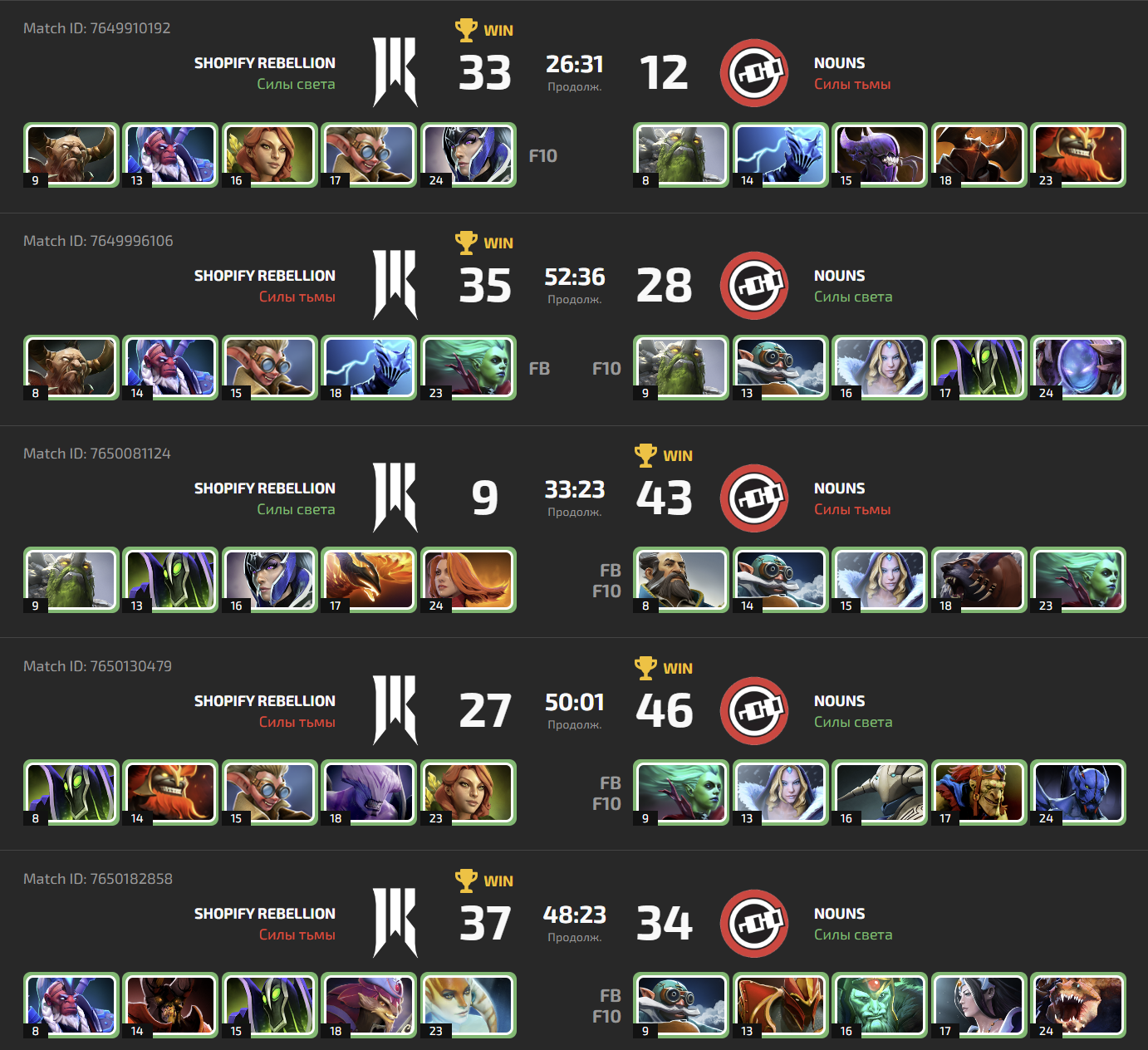 Третья карта выдалась полным разгромом Shopify Rebellion, Nouns убили потчи в пять раз больше героев. Yopaj старался как мог, но Arteezy не вышел даже в KDA единицу.