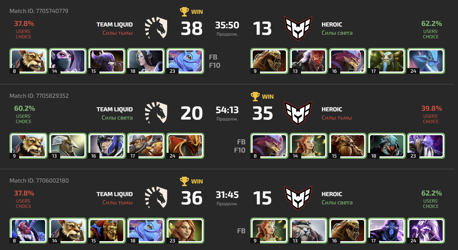 На первой карте Team Liquid передрафтили своего оппонента. Это была легкая игра для Nisha на Puck, его финальный счет 11/1/19, Heroic нечего было ему противопоставить. Стоит отметить хорошую игру ЗЗ на сигнатурном Brew Master с KDA 6/2/13. На второй Team Liquid взяли очень темповый набор героев, рассчитывая быстро закончить игру. В результате им не удалось провести игру по такому же сценарию, что и все игры с Chen в пике, которого Heroic, на удивление, не забанили, как это делают все команды на ESL One Birmingham 2024. 4nalog и его союзники отлично постояли свои линии, что стало ключом к победе, все коры Heroic в конце имели KDA больше десяти. Решающая карта прошла в одну калитку в пользу Team Liquid, взяв сильнее драфт, они уверенно закончили игру за 32 минуты и прошли дальше по турнирной сетке.