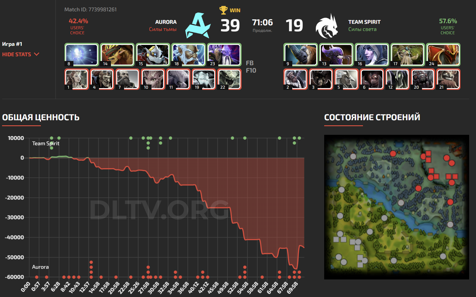 На первой карте Aurora взяли себе сильный драфт против пика Team Spirit, Bristleback в роли танка, а Clockwerk и Dark Seer не только способны легко контринициировать врыв Magnus от Collapse, но и внести много демеджа своей комбинацией скиллов за счет Wall of Replica в Yatoro на Drow Ranger и в Larl на Dragon Knight. Aurora затемповали, набрали гигантское преимущество, но не смогли зайти на хайграунд, поэтому игра затянулась. Все закончилось благодаря Q на Clockwerk, который развел Team Spirit на байбек и забайтил всех врагов выйти с базы. jabz показал отличный перфоманс на Dark Seer и поучаствовал в 92% убийств за 71 минуту игры.