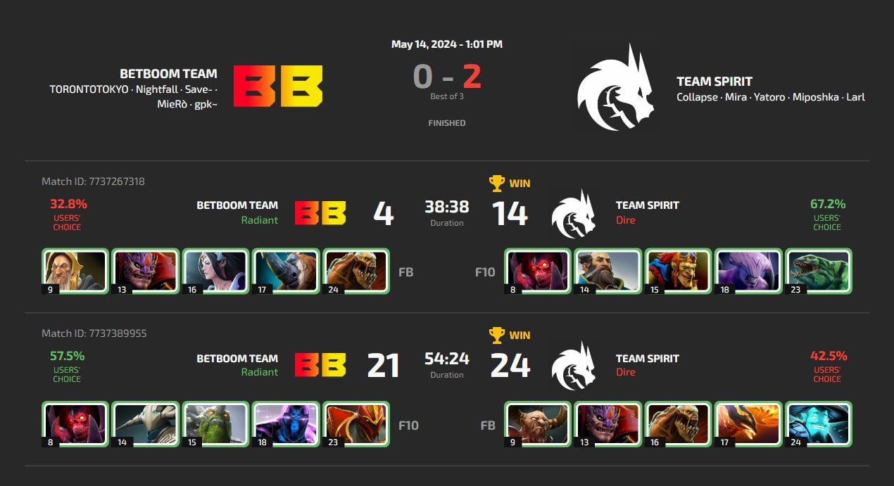 Обе карты получились пассивными и прошли при полной доминации Team Spirit. Более запоминающейся оказалась вторая карта, где игроки показали несколько нестандартных билдов. Yatoro на Lifestealer купил все предметы на выживаемость, его главной задачей было пережить два Black Hole от MieRo` на Enigma. Под конец игры, в инвентаре керри Team Spirit оказались "Линка" , "Аганим", "БКБ", "Нулифаер", "Кираса" и "Мьельнир". Nightfall на Sven предпочел взять Bloodthorn. Саппорты Team Spirit собрались в полноценных коров, не купив ни одного саппорт-предмета, а Save выделился общей ценностью в девять тысяч в 55 минутной игре. MVP матча забрал Collapse на Centaur Warrunner, закончивший серию с общей статистикой 11/5/21 и поучаствовавший в 84% всех убийств команды.