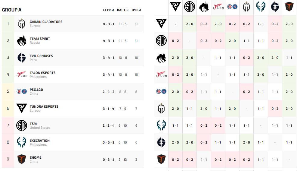 Завершились матчи в группе "A" на The Lima Major 2023 и все без переигровок. Места в верхней сетке себе гарантировали Gaimin Gladiators, Team Spirit, Evil Geniuses и Talon Esports. В нижней сетке начнут PSG.LGD и Tundra Esports. Турнир покинули TSM, Execration и EHOME.