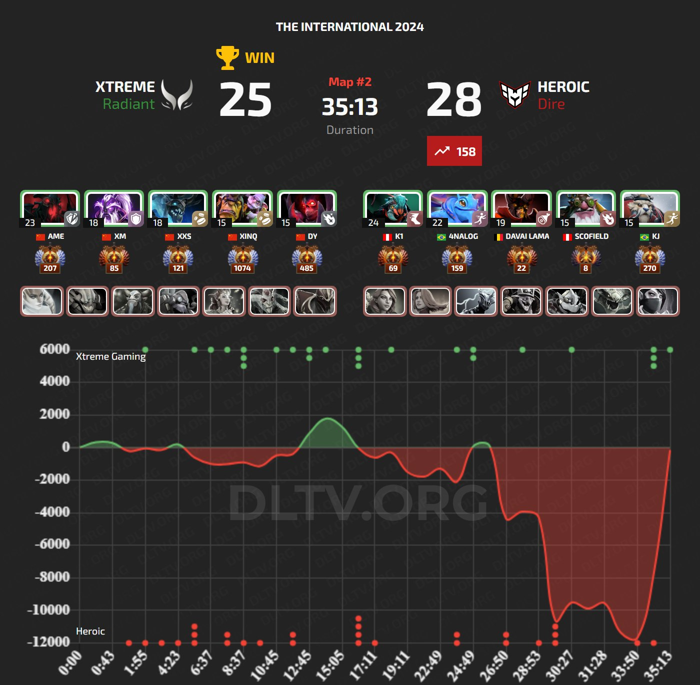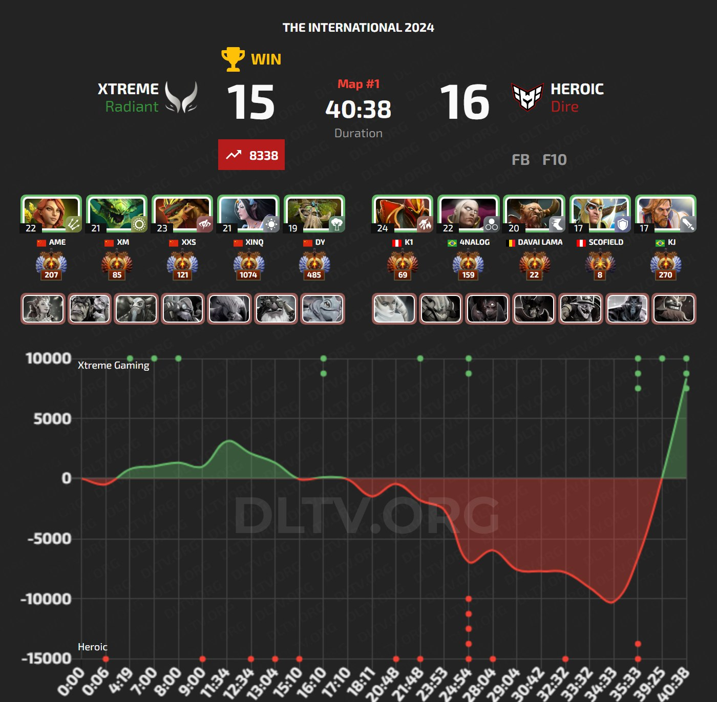 Xtreme Gaming победили Heroic со счетом 2-0 в первом матче группового этапа на The International 2024. Весь матч китайская команда находилась в проигрышной ситуации, но Xtreme Gaming дважды удалось перевернуть исход в свою пользу.